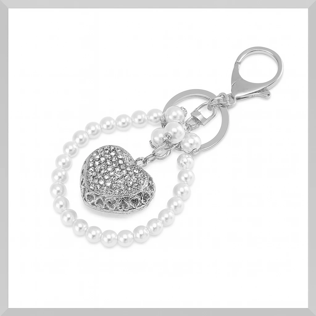 Designul său versatil, cu detalii atent finisate, include un șir delicat de perle sintetice, un inel metalic dublu și o inimă sclipitoare încrustată cu cristale fine. Sistemul de prindere este practic și sigur, prevăzut cu carabină rotativă, ușor de atașat pe orice suport.