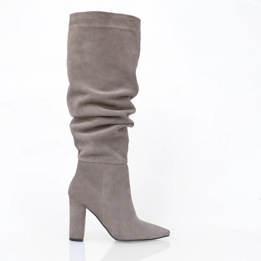 Rafinament minimalist, cu un plus de confort. Realizate din piele naturală gri, cu căptușeală naturală și toc imbracat de 9 cm, aceste cizme fronsate se remarcă prin elasticul integrat, care oferă flexibilitate și adaptabilitate la diferite conformații. O alegere chic pentru zi și seară.