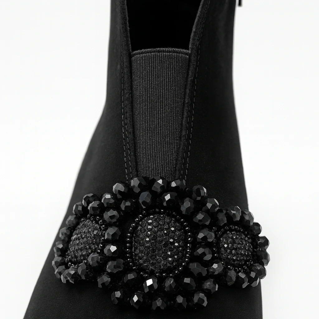 Silveta minimalistă, în nuanță neagră, se integrează ușor în ținute casual-chic sau elegante. Poartă-le cu rochii tricotate, fuste midi, pantaloni conici sau blugi și un palton drept. Detaliul cu mărgele adaugă un plus de personalitate fără a încărca vizual outfitul.