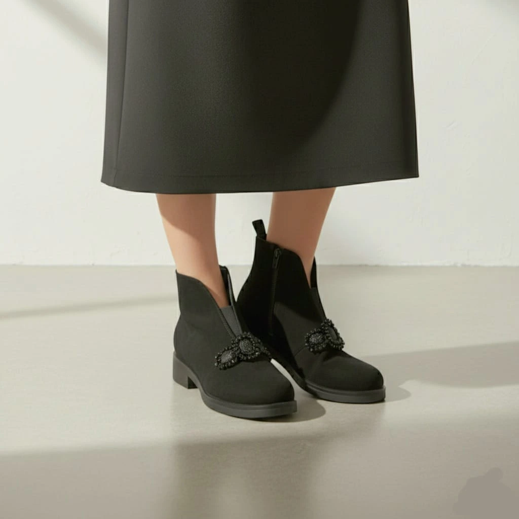 Completează-ți garderoba de sezon cu o pereche de ghete care îmbină eleganța clasică cu funcționalitatea modernă. Confecționată integral din piele întoarsă naturală de înaltă calitate, această gheată impresionează prin textura catifelată, linia curată și aplicația decorativă cu mărgele negre – un accent sofisticat care transformă un model versatil într-o piesă statement.